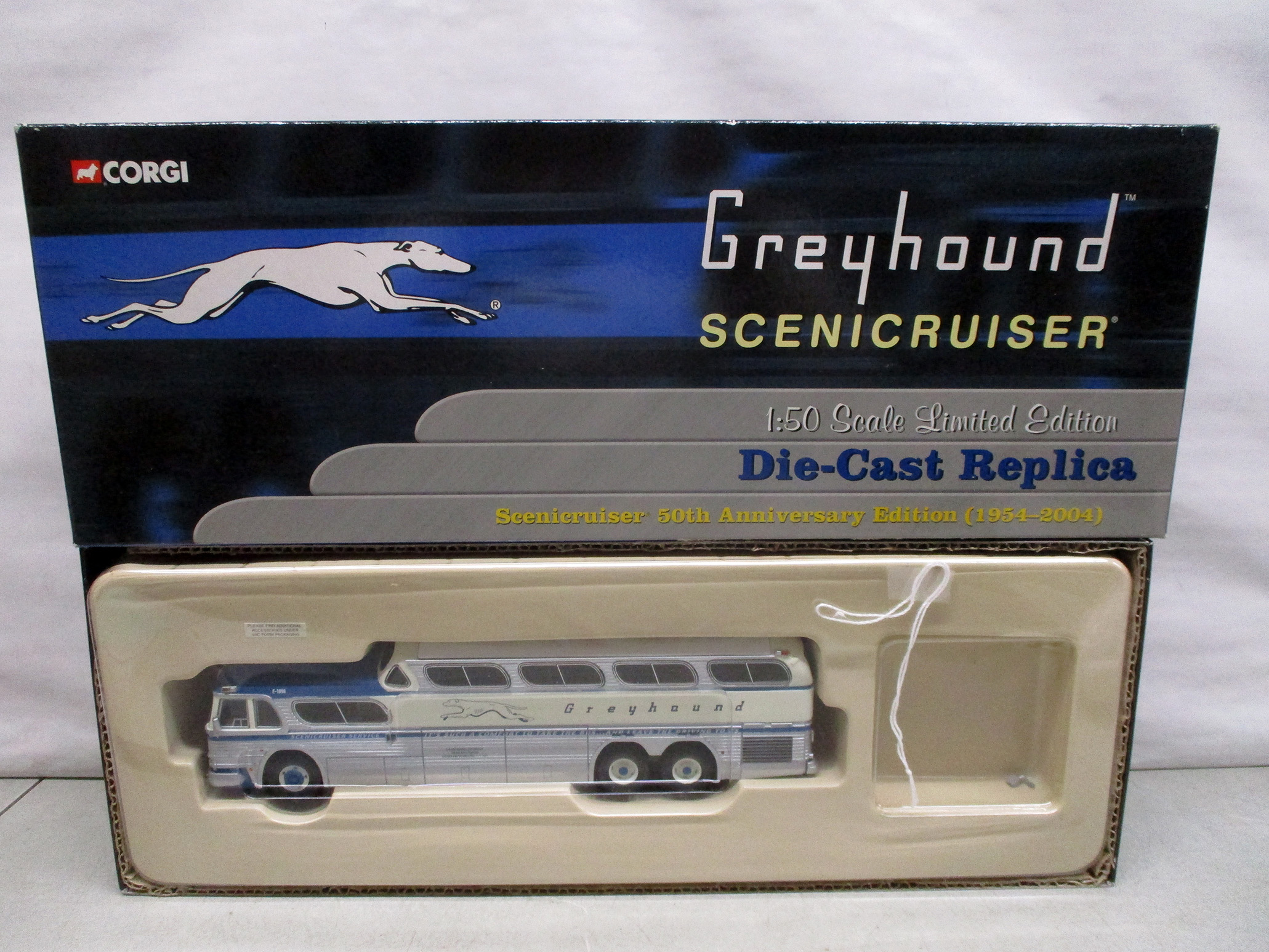 This is a model bus by MTH Electric Trains, under their RailKing product line. The model represents a Greyhound Lines bus and is made from high-quality materials. (Click image to see high resolution version).