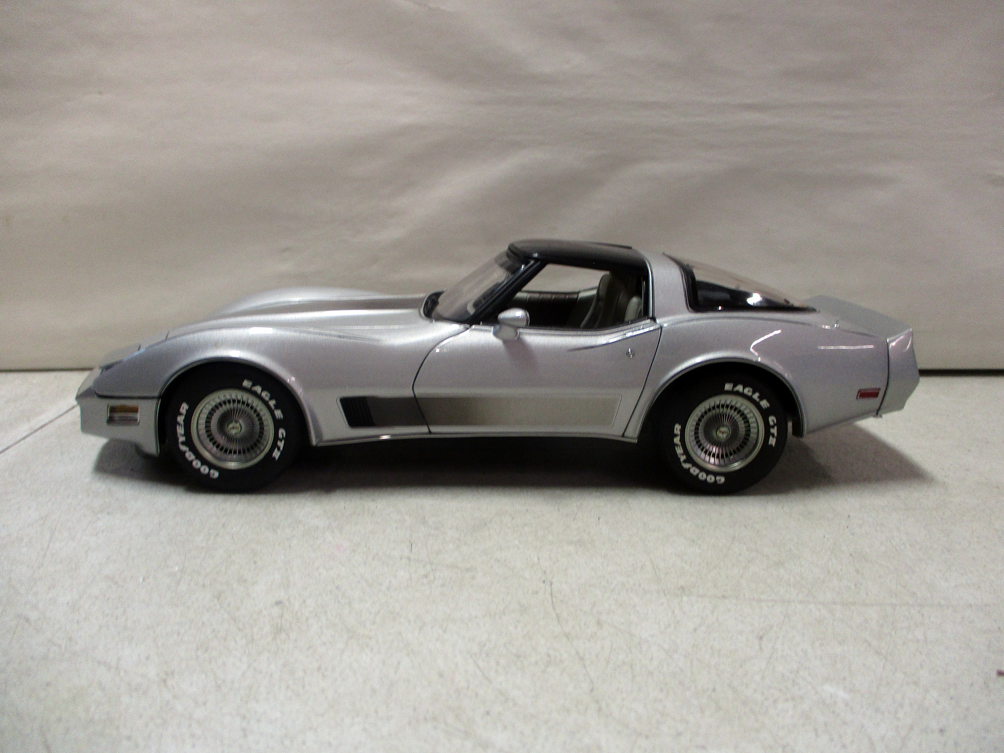 Die-cast model of a Chevrolet Corvette in silver finish. Features realistic details, including rubber tires, interior styling, and external decals. The scale and manufacturer are not specified. The car design replicates the iconic Corvette style with a T-top roof. The model is in displayable condition with visible intact components, but the overall wear is not listed. (Click image to see high resolution version).