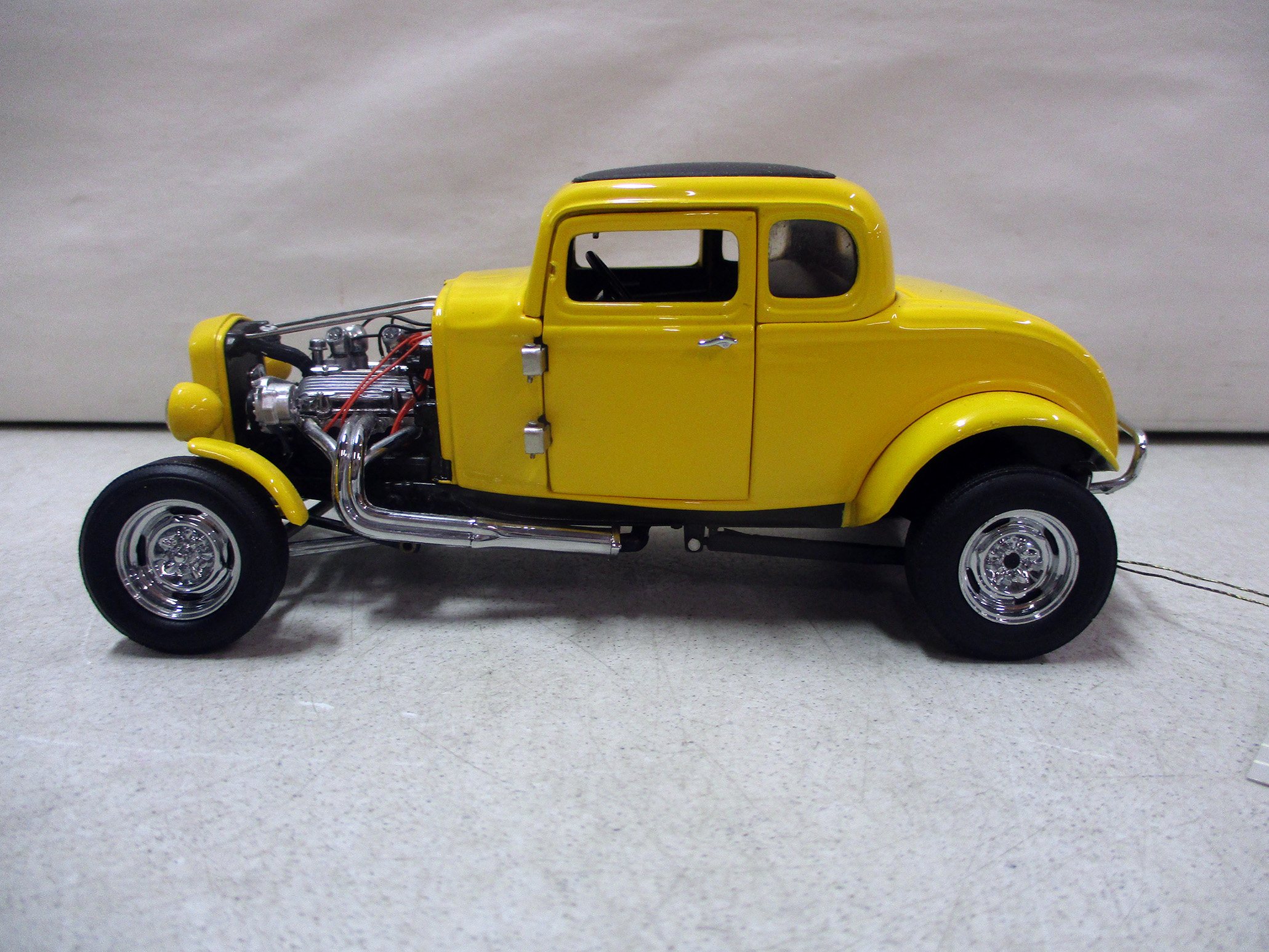 A die-cast model of a yellow hot rod car with black roof accents. Features detailed engine, chrome wheels, and exhaust. The scale, maker, and dimensions are not specified. Suitable for collectors or display purposes. The model is in good visual condition with no apparent damages or missing parts visible. (Click image to see high resolution version).