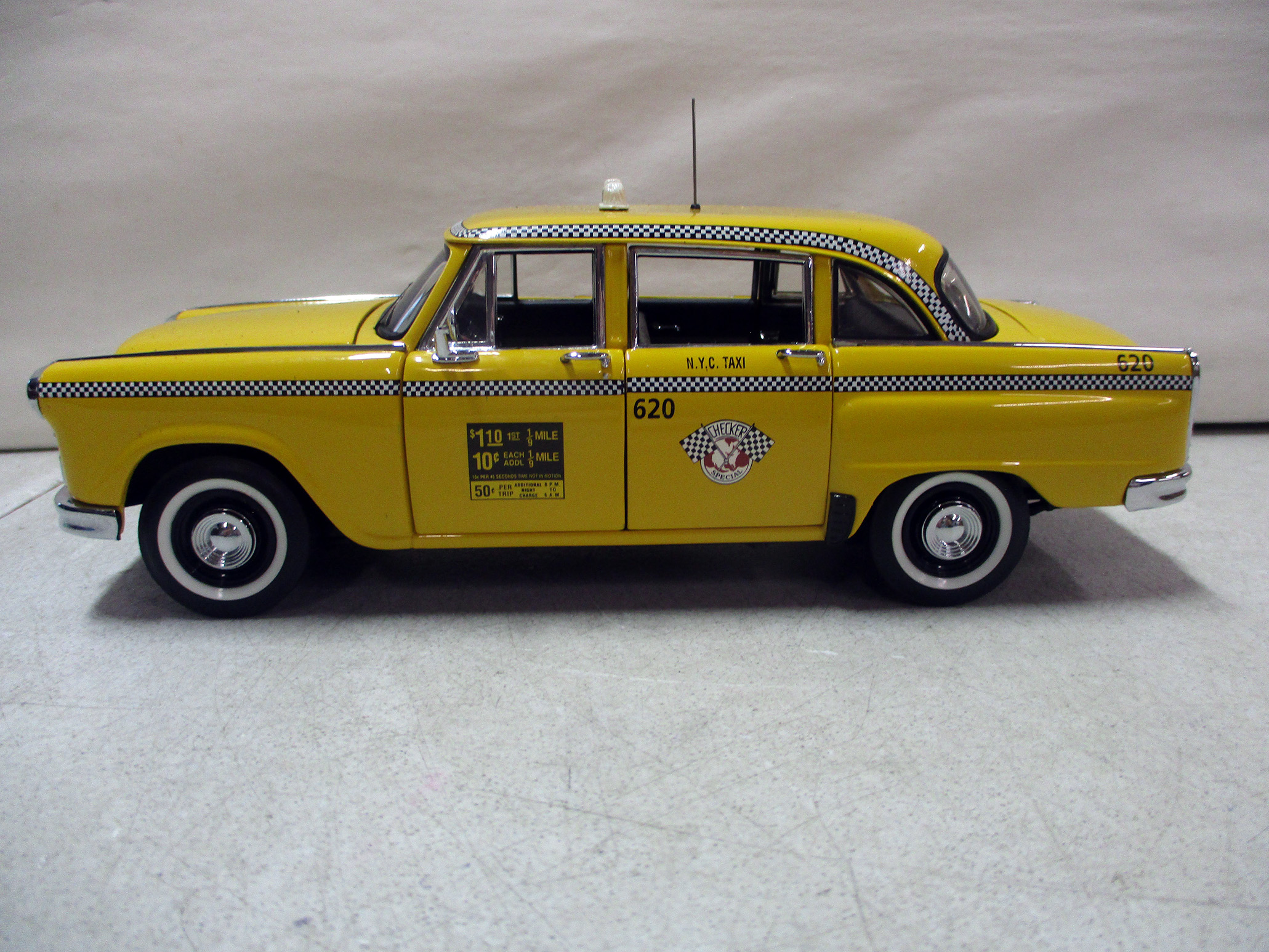 Diecast model of a classic yellow Checker taxi cab in 1:24 scale. The model features a checkerboard pattern along the upper body, a taxi roof light, and detailed interior and exterior designs. The side doors display a vintage-style taxi company decal. An ideal collector's item or display piece. (Click image to see high resolution version).