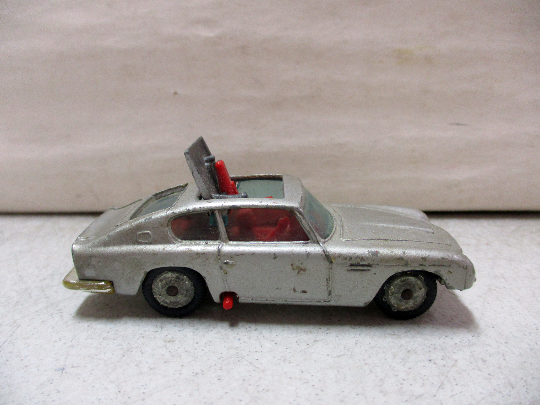 A gold-colored die-cast car model featuring a retro design with a functional retractable feature on the rear. The car has a well-worn finish, evident through visible signs of use and wear. Made of metal with some plastic details, including the wheels and windows. Likely designed as a collectible or toy model. (Click image to see high resolution version).
