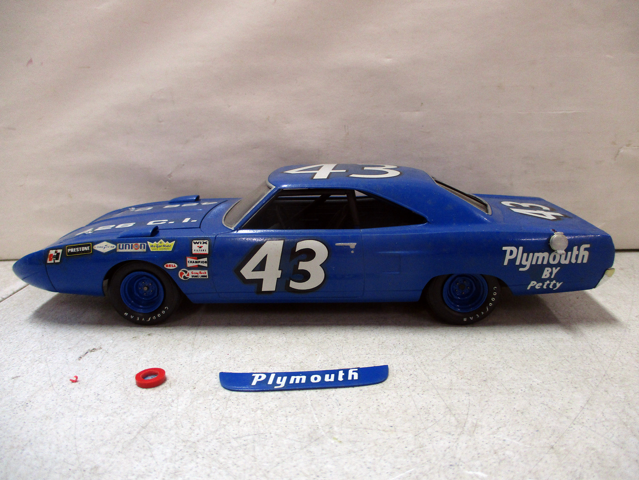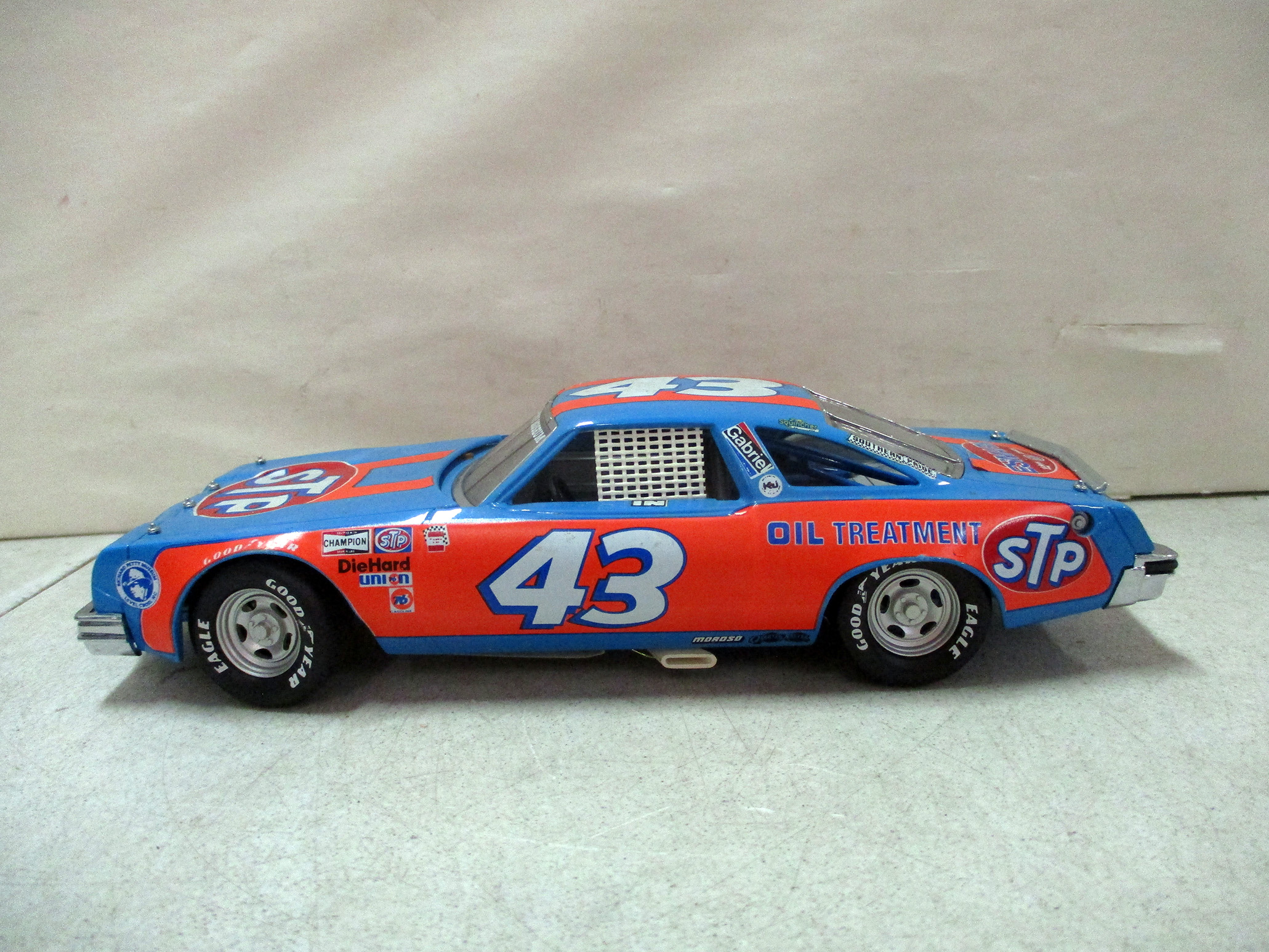 This is a vintage MPC Petty Charger NASCAR model kit, made in the USA. The kit includes unassembled plastic components and instructions. It is a 1/25 scale model, designed for ages 8 to adult. The model kit features the iconic #43 car driven by a famous professional driver. It is an official NASCAR sanctioned product. (Click image to see high resolution version).