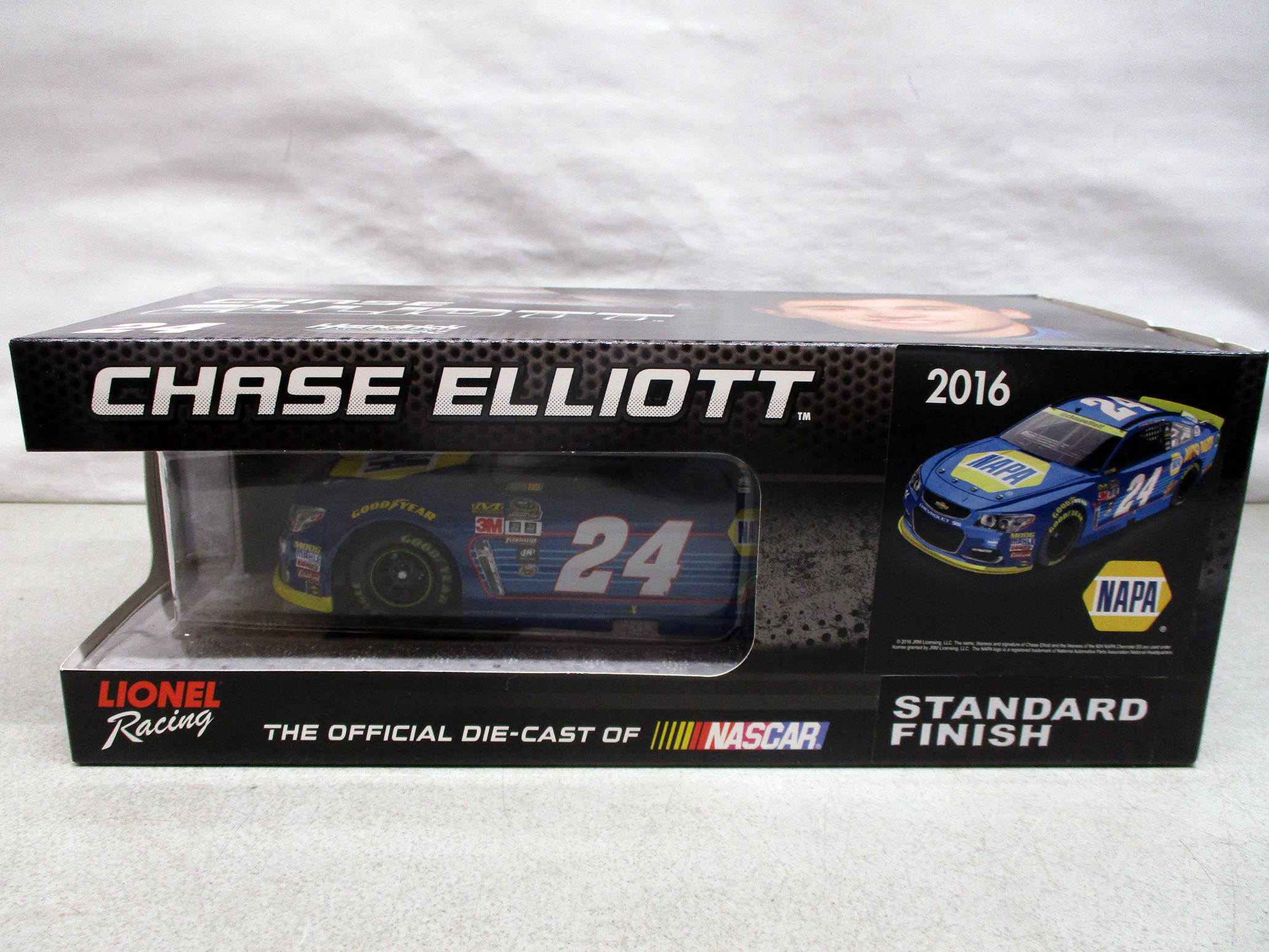 Lionel Racing die-cast model car featuring Chase Elliott's 2016 NASCAR design. Packaged in original box with clear window, marked as the official die-cast of NASCAR. Includes NAPA branding and car number 24. Standard finish model in collectible condition. Box may show minor handling wear. (Click image to see high resolution version).