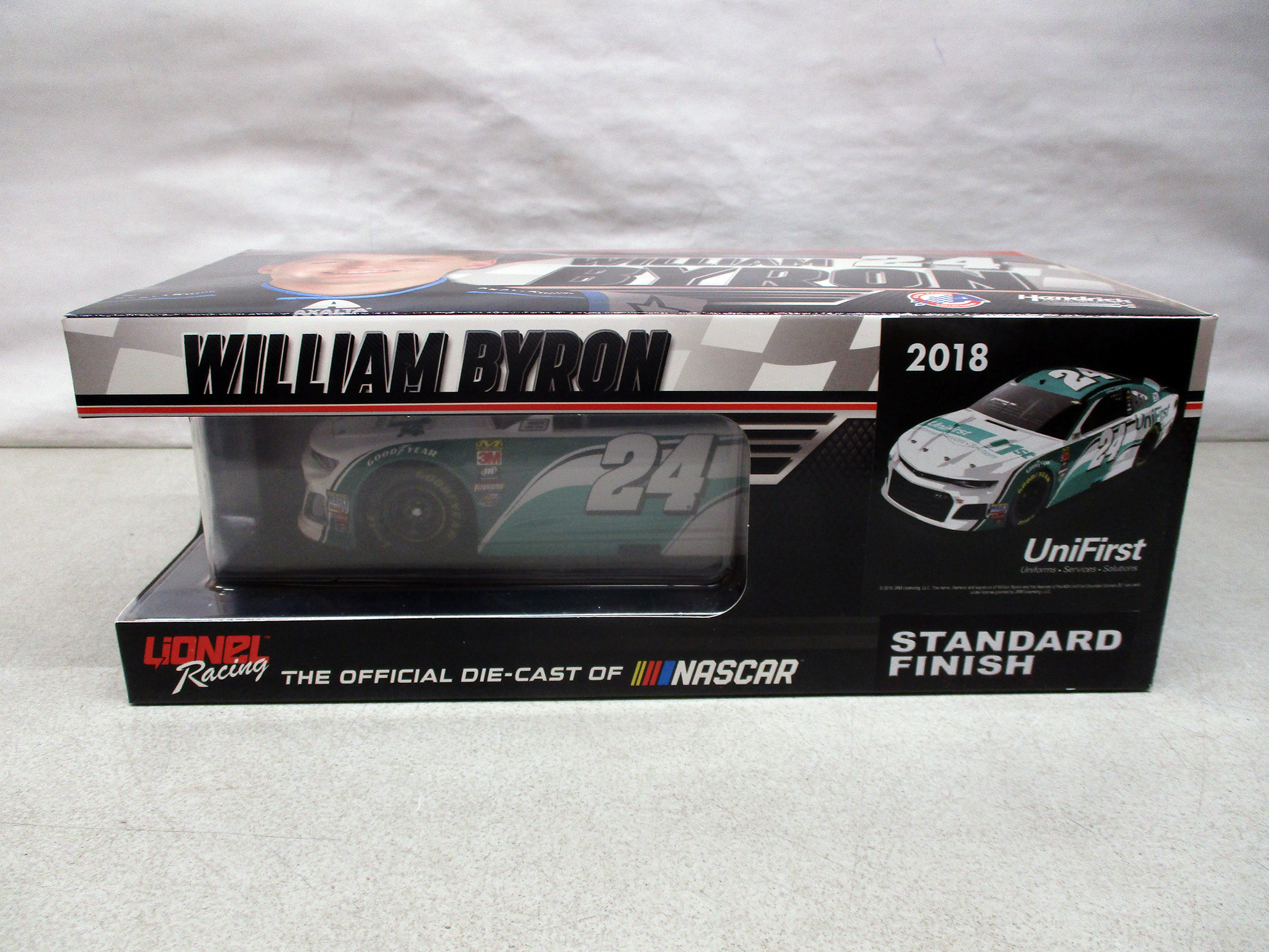 Lionel Racing die-cast NASCAR car representing William Byron's 2018 No. 24 Chevrolet Camaro ZL1 in the UniFirst livery. Standard finish edition. The car is enclosed in its original packaging, which features William Byron's name and an image of the car. Officially licensed product by NASCAR. (Click image to see high resolution version).