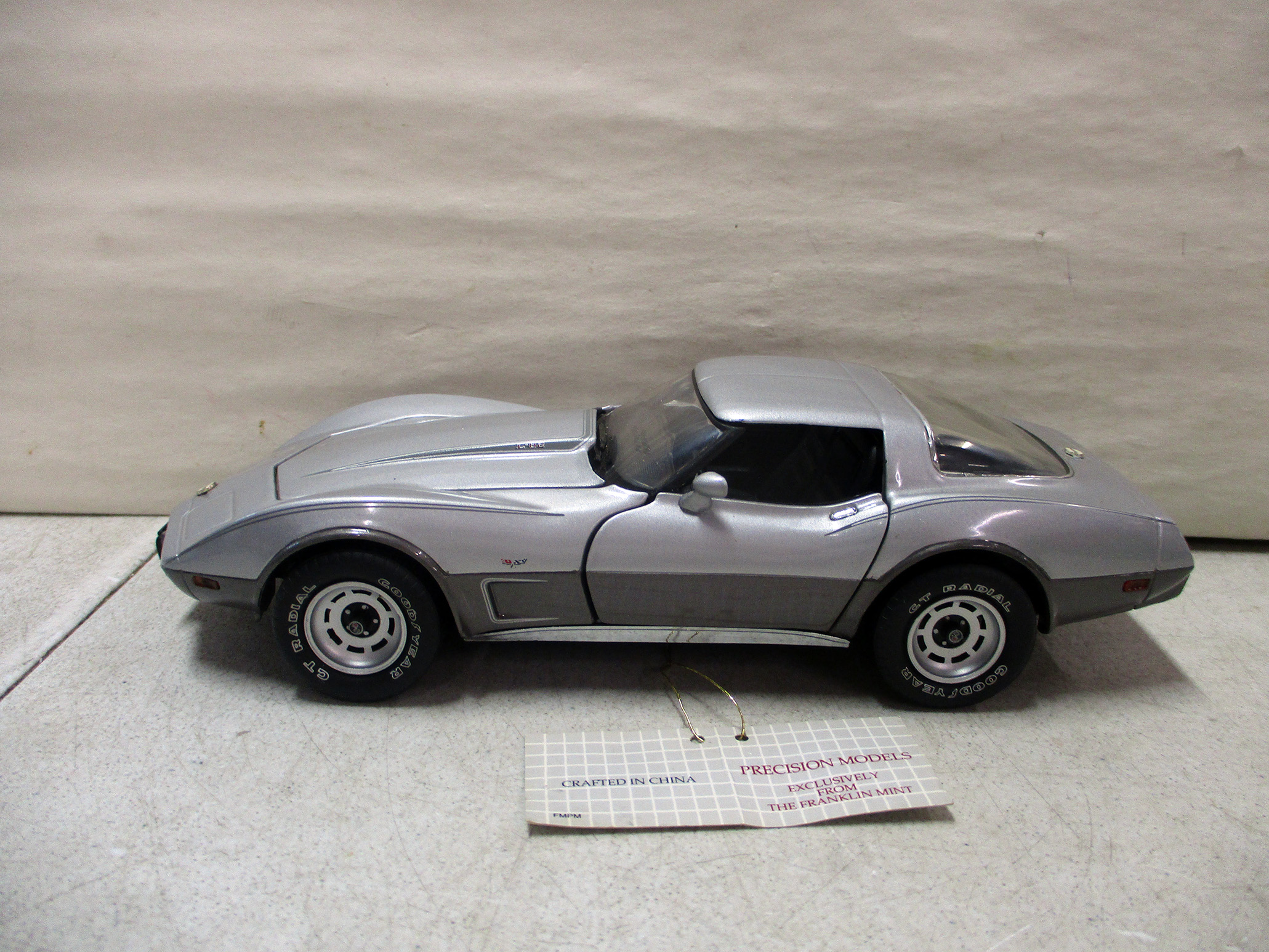 A finely crafted die-cast 1:24 scale model of the 1978 Chevrolet Corvette in silver color. Features include detailed interior, accurate exterior design, and realistic wheels. The model comes with a small printed label and appears to be in very good condition. Made in China. (Click image to see high resolution version).