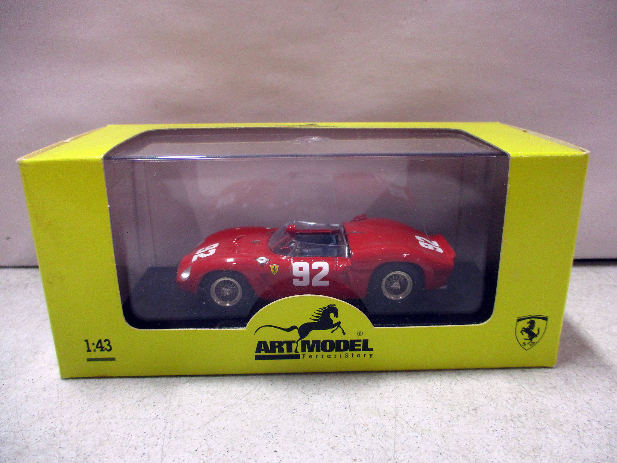 Art Model diecast model in 1:43 scale, featuring a detailed Ferrari racing car. The car is painted in red with the number '92' displayed prominently. It comes securely housed in its original yellow branded cardboard box with a clear plastic display for viewing. Condition appears intact, including the packaging. (Click image to see high resolution version).