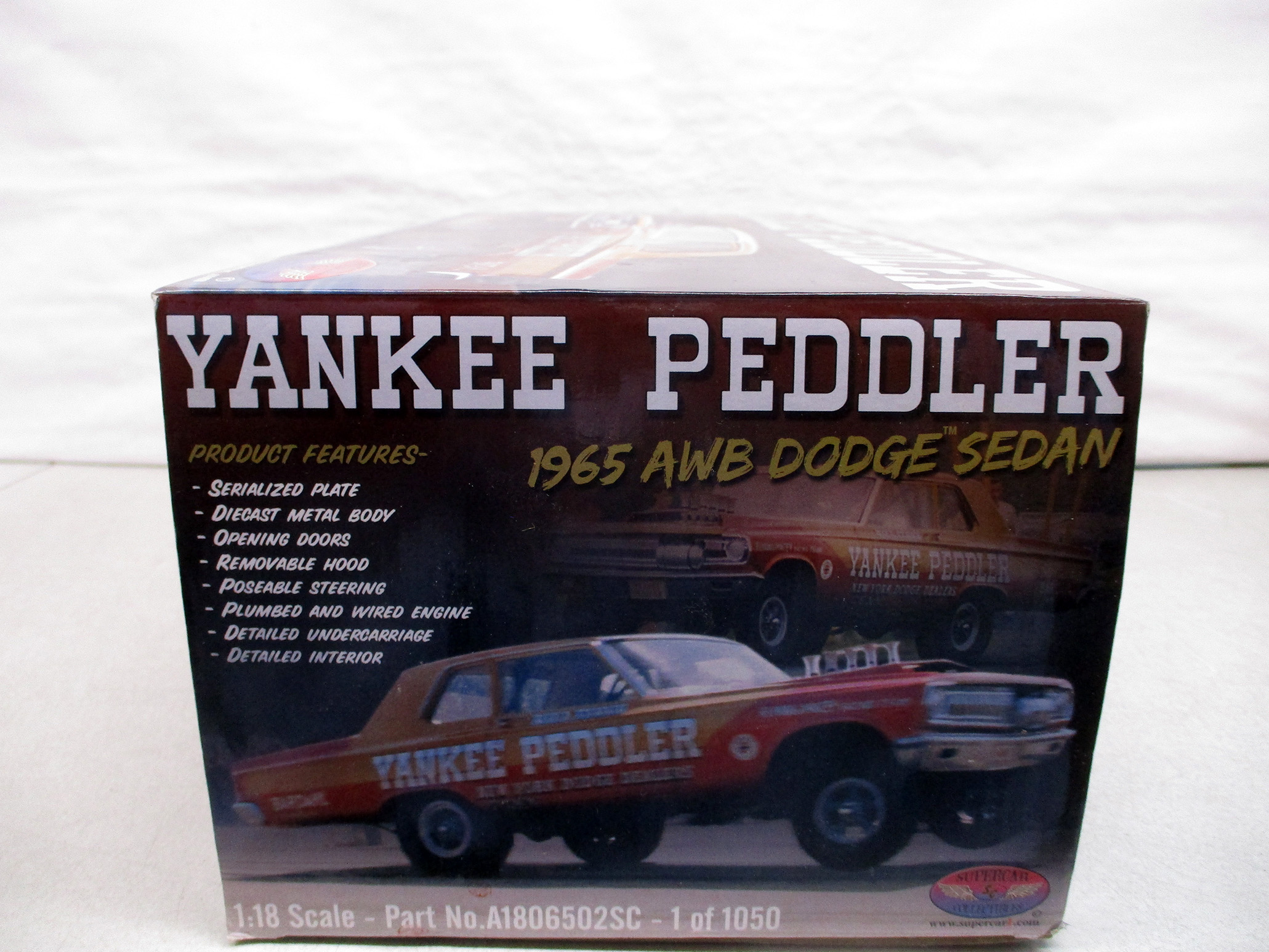 1965 AWB Dodge Sedan Yankee Peddler 1:18 scale diecast model car produced in limited quantity (1 of 1050). Features include a serialized plate, detailed metal body, opening hood, poseable steering, fully wired engine, opening doors, detailed undercarriage, and a detailed interior. Comes in its original packaging. (Click image to see high resolution version).