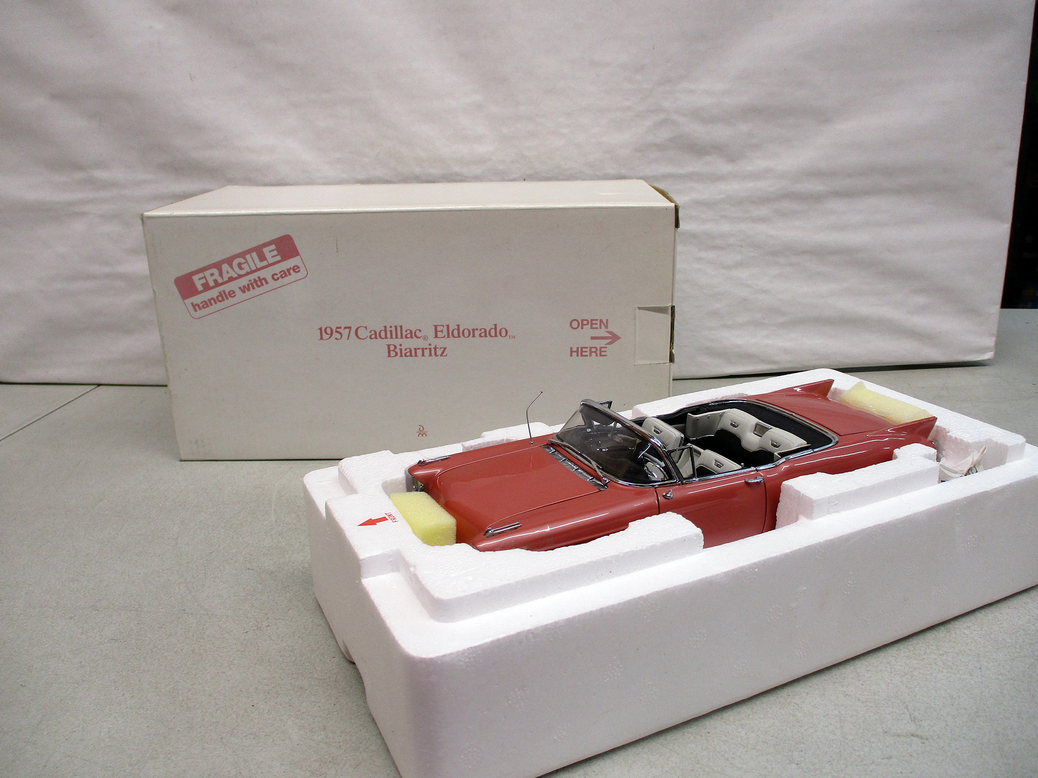 Die-cast model of the 1957 Cadillac Eldorado Biarritz in red with a detailed interior and exterior. Comes with the original styrofoam protection and outer box marked 'Fragile' with the model name. Appears to be in excellent condition with protective packaging intact, showing no visible signs of damage or wear. (Click image to see high resolution version).