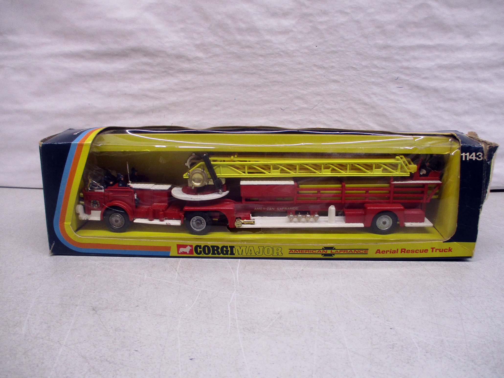 Corgi Aerial Rescue Truck die-cast model, item number 1143, in its original packaging. The model replicates a red fire truck with a yellow aerial rescue ladder and detailed design features. The packaging shows some signs of wear but appears intact. The item is ideal for collectors of Corgi die-cast vehicles or fire rescue models. (Click image to see high resolution version).