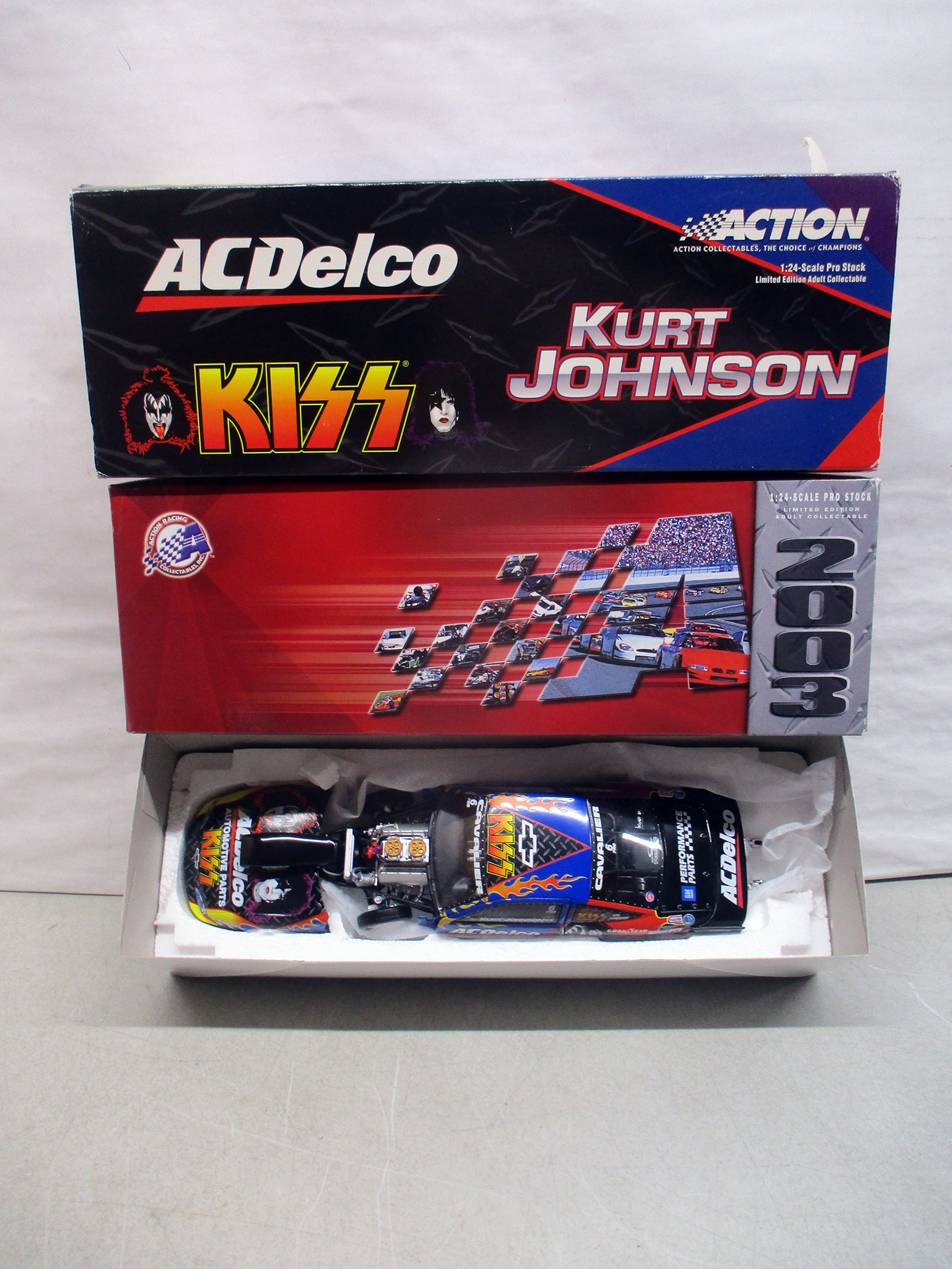 ACDelco Kurt Johnson die-cast drag racing car from Action Racing Collectibles, featuring KISS branding. Includes original box and protective foam insert. Box and car graphics are in excellent condition. A collectible item celebrating KISS and professional drag racing. (Click image to see high resolution version).