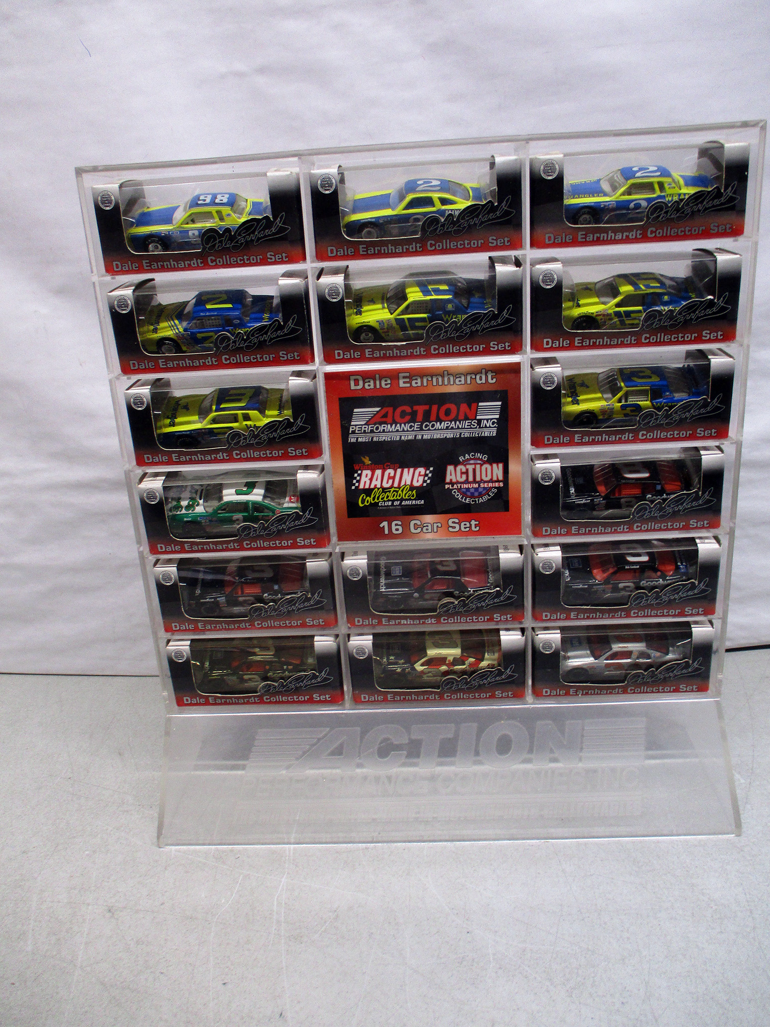 Dale Earnhardt die-cast car collector set featuring 16 miniature cars, encased in a clear Action-branded display case. Each car showcases sponsor-specific liveries and designs associated with Dale Earnhardt's racing career. Manufactured by Action Racing Collectables. Items and case appear well-preserved, suitable for display or collector purposes. (Click image to see high resolution version).