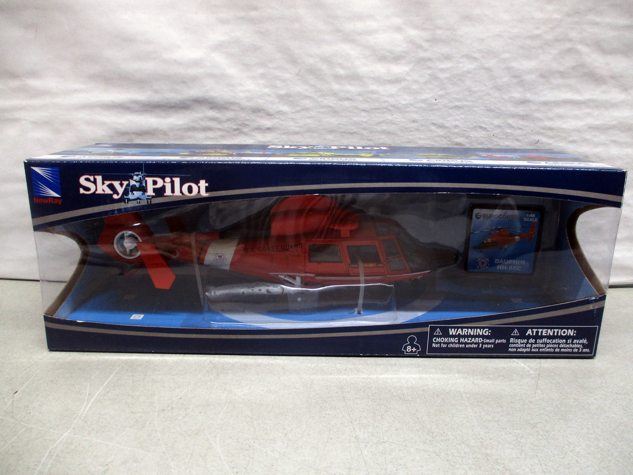 Sky Pilot die-cast helicopter model featuring red and black color scheme and displayed in its original packaging. The package includes detailed label information and artwork on the exterior. Item has not been removed from the box, making it suitable for collectors. Dimensions and production details are not specified. (Click image to see high resolution version).