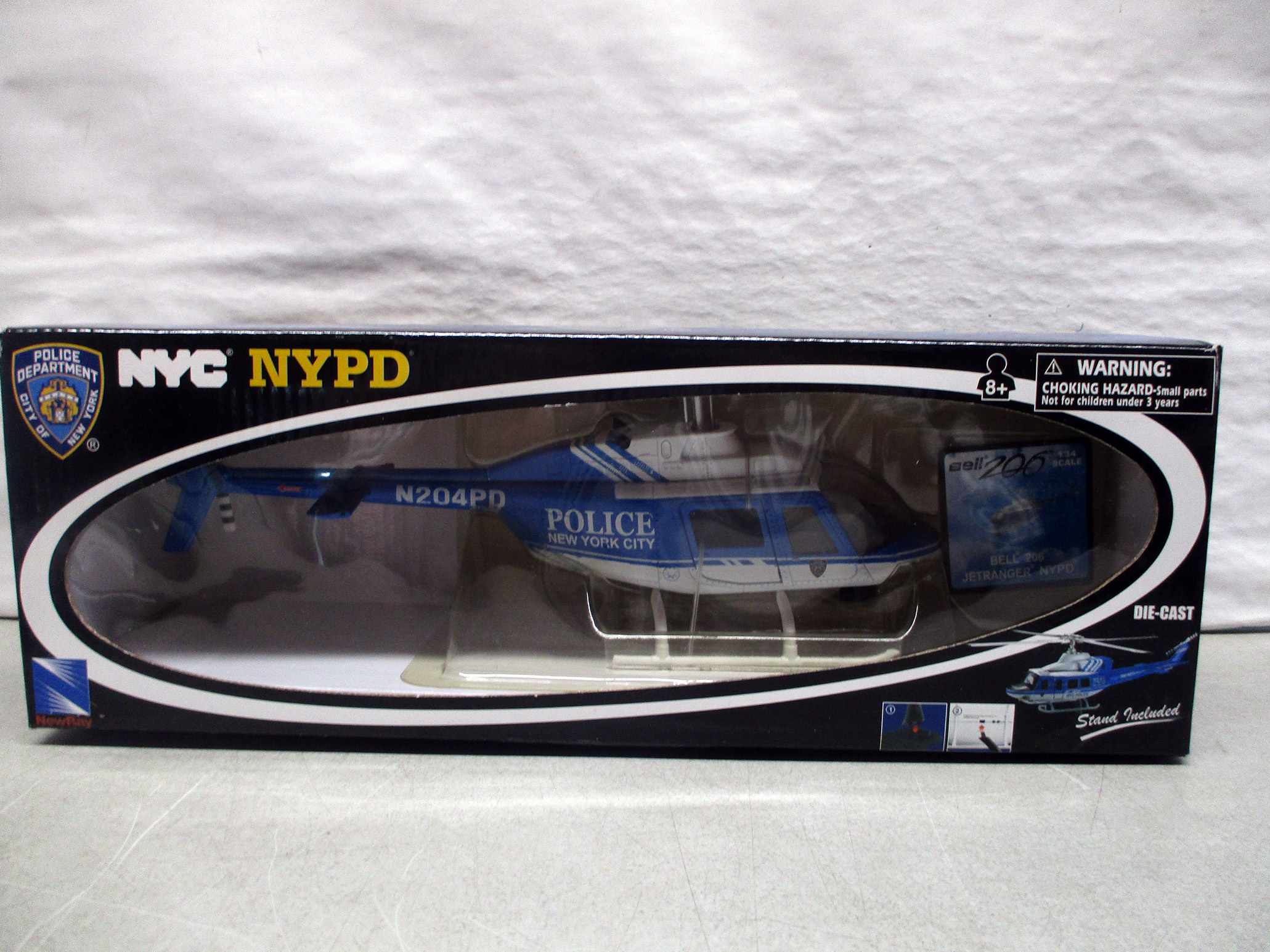 NYPD die-cast helicopter model in its original packaging. Features a detailed replica with the designation 'N204PD' and police markings. The box indicates suitability for ages 8 and over and includes a warning for small parts. Packaging is intact and provides display visibility for the item. (Click image to see high resolution version).