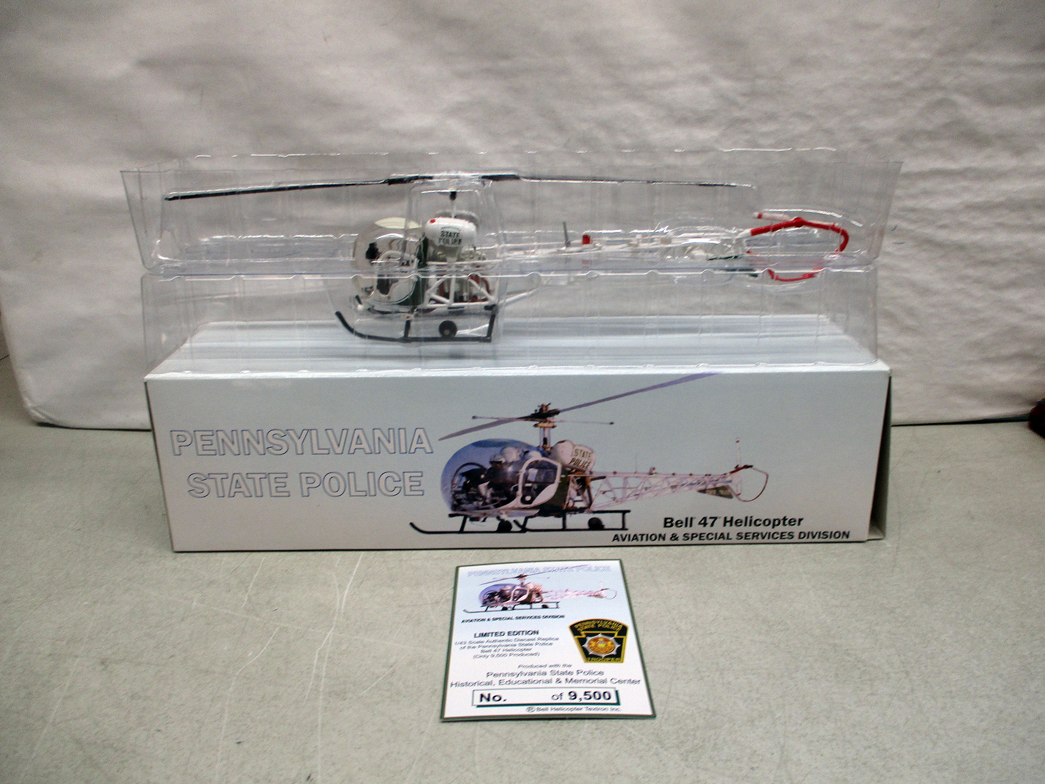 Pennsylvania State Police Bell 47 Helicopter collectible model with original display box. Includes a stand and informational display card. Labeled for the Aviation & Special Services Division. Made of plastic and appears to be in excellent condition, with all pieces included as shown. (Click image to see high resolution version).