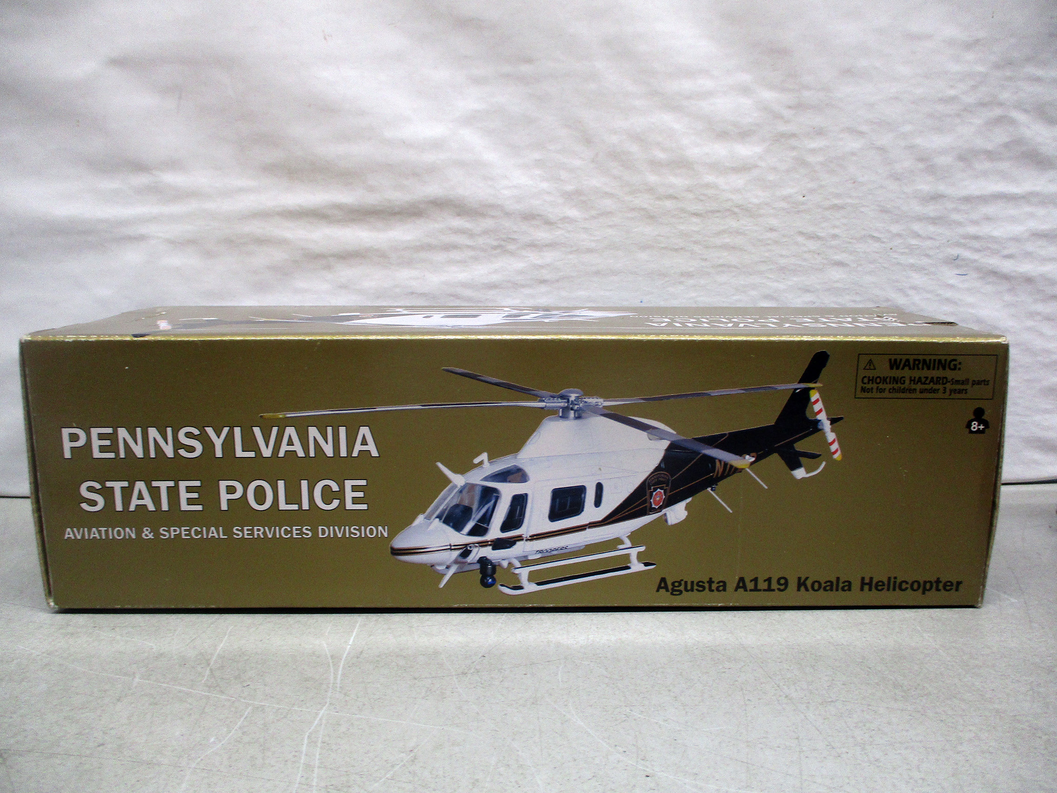 Agusta A119 Koala Helicopter model in Pennsylvania State Police livery, from the Aviation & Special Services Division. The collector's box remains sealed and in good condition. Intended for ages 3 and up. Officially licensed product featuring a detailed replica. (Click image to see high resolution version).