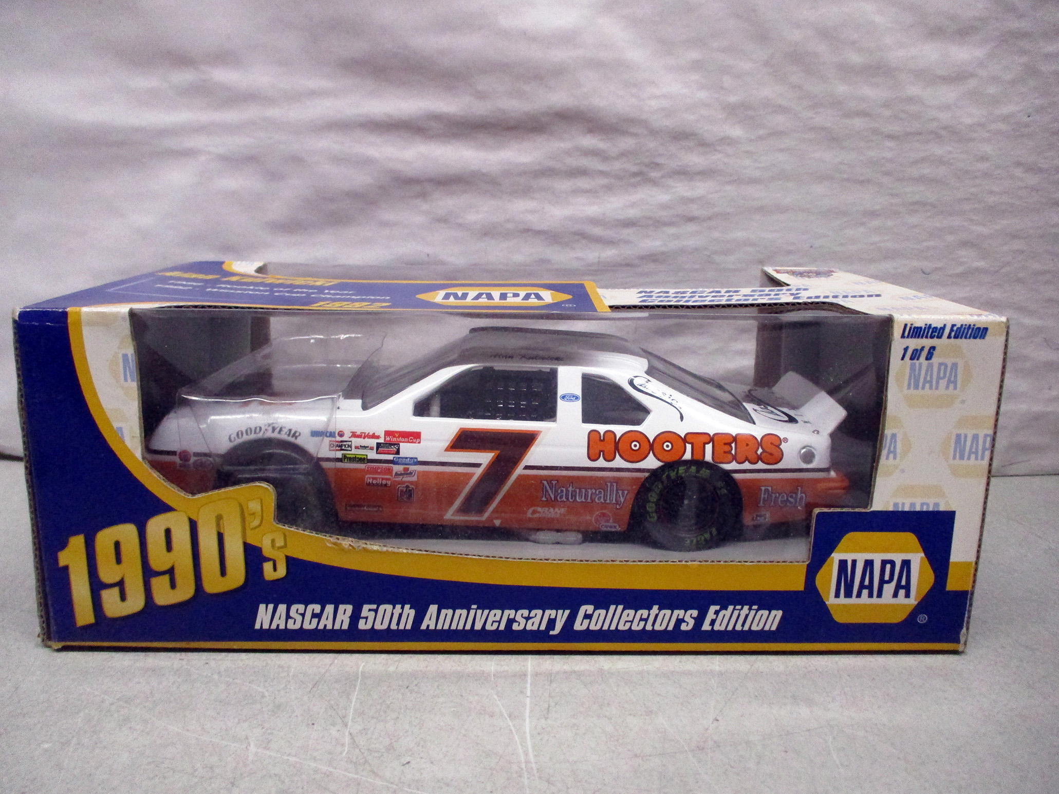 Limited edition 1:64 scale diecast model car from the 1990s, commemorating NASCAR's 50th Anniversary. Features Hooters and related sponsor branding on the car body. Original packaging included, marked with 'NAPA' logos and branding. Item appears to be unopened and in displayable condition. (Click image to see high resolution version).