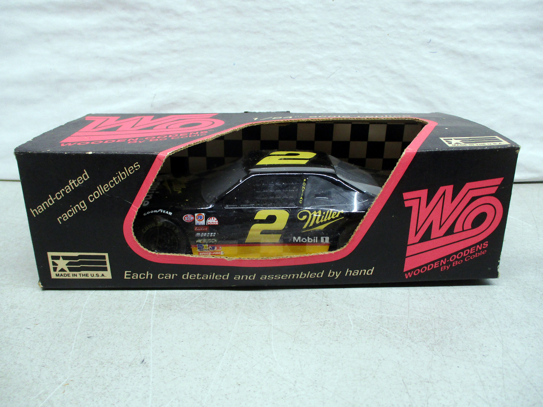 Wooden Wonders handcrafted racing collectible featuring a replica of the number 2 racing stock car with 'Miller' and 'Mobil 1' livery. Packaged in its original box with checkered pattern accents and bold logos. The box states 'hand-crafted' and 'detailed and assembled by hand'. Condition includes visible packaging wear but remains sealed and intact. (Click image to see high resolution version).