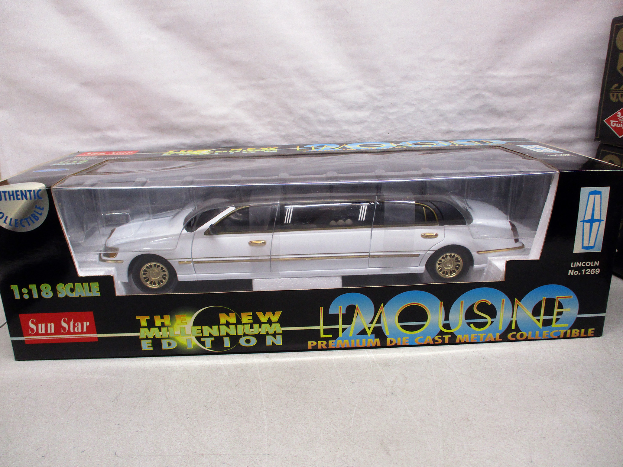 1:18 scale model of a Lincoln limousine from Sun Star's New Millennium Edition collection. Premium die-cast metal construction with authentic detailing. Packaged in original box showing model number 1626. Box appears intact and includes display window. Suitable for collectors or display purposes. (Click image to see high resolution version).