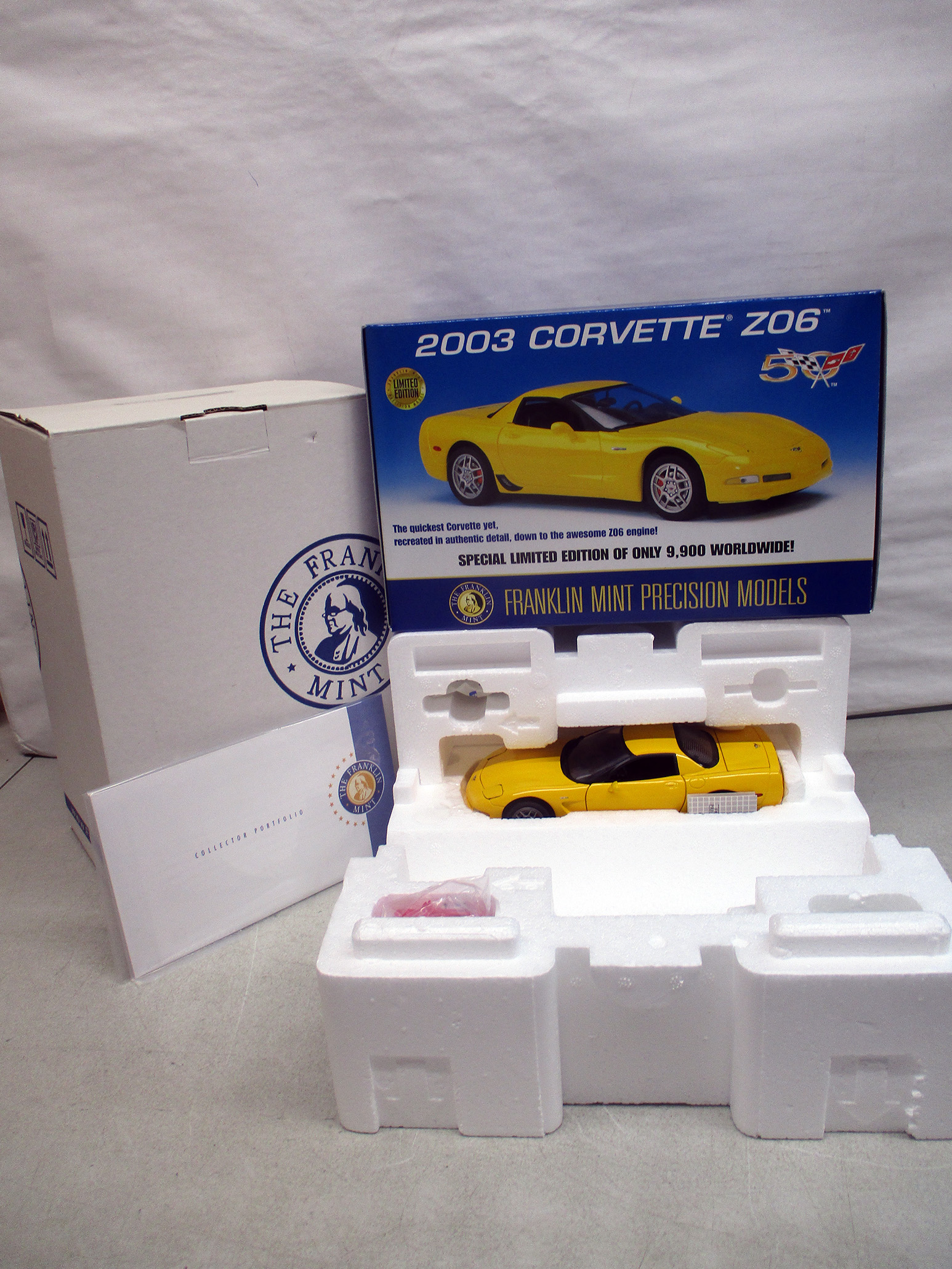 Franklin Mint Precision Models 2003 Corvette Z06 die-cast car in yellow. Includes original box, molded Styrofoam packaging, and informational booklet. The model is highly detailed and appears to be in excellent condition. The item is a collectible and part of a limited-edition series. (Click image to see high resolution version).