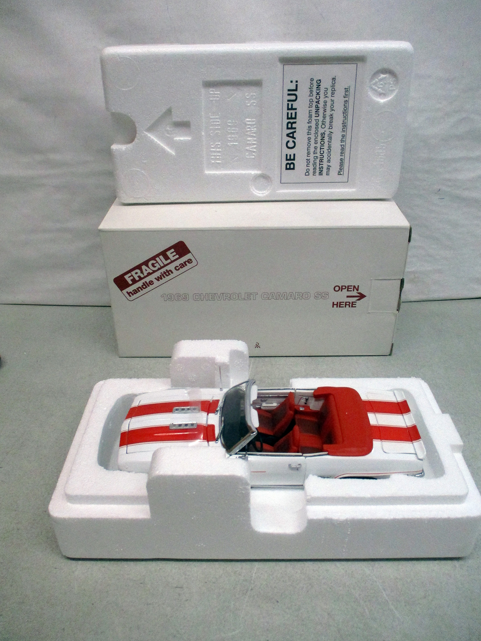 This is a die-cast model of a 1967 Chevrolet Camaro RS/SS Convertible, originating from the United States. It is crafted from metal and plastic materials. Produced by The Danbury Mint, this collectible model is a faithful miniature representation of the classic car. The accompanying certificate indicates its specific production details. (Click image to see high resolution version).