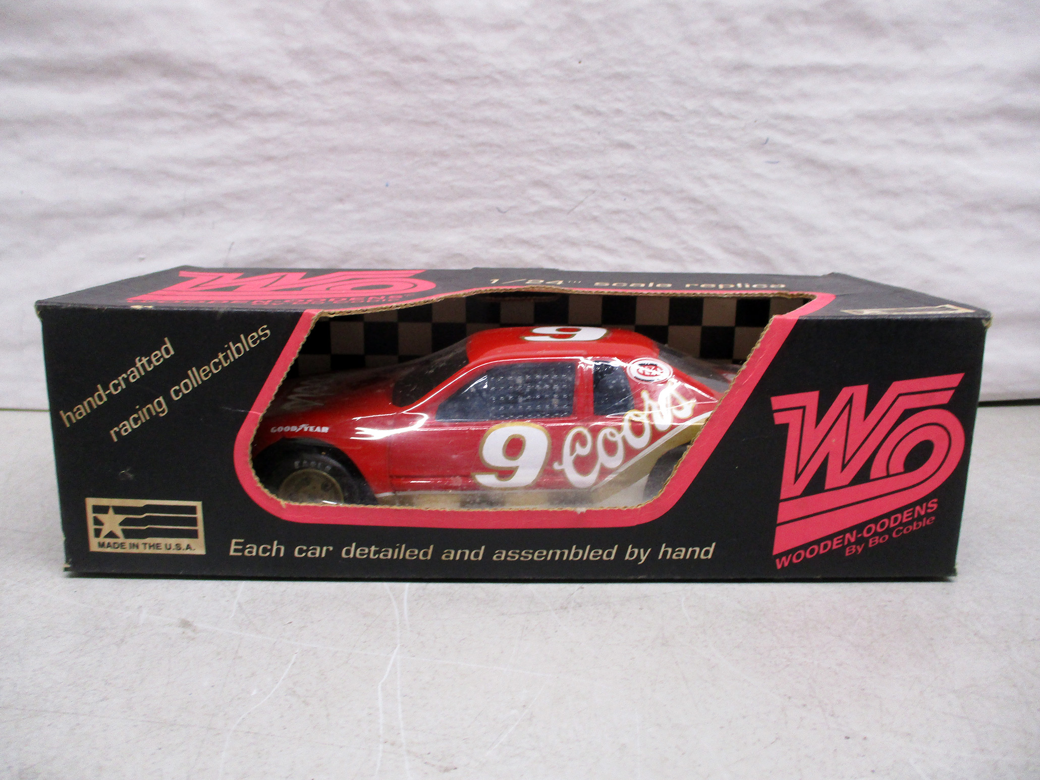Handcrafted racing collectible of the No. 9 Coors car by Wooden Oddities. The item features detailed craftsmanship and assembly by hand. Includes the original box with window display, showcasing the car inside. The box shows slight signs of wear but remains intact. The car appears to be in preserved condition within the packaging. (Click image to see high resolution version).